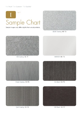 First Trust! First Customer! First Quality! Ⅰ 1 of 2 Sample Chart Sample images may differ slightly from actual products. BEAD Coating KK-T4 VIB Coating KK-T1 MIRROR KK-T5 Check Coating KK-T2 HL Black KK-T6 Quilt Coating KK-T3 VIB Black KK-T7